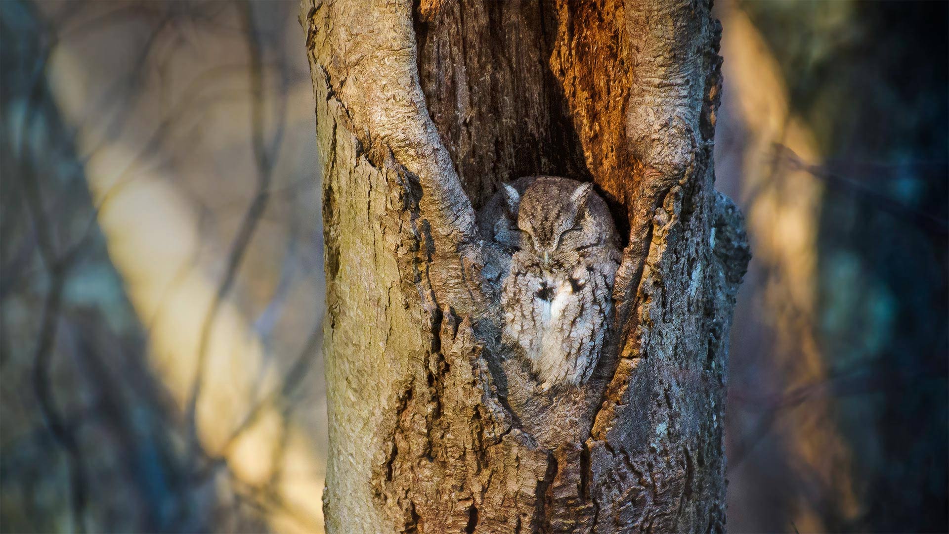 Screech owl resting in a tree cavity