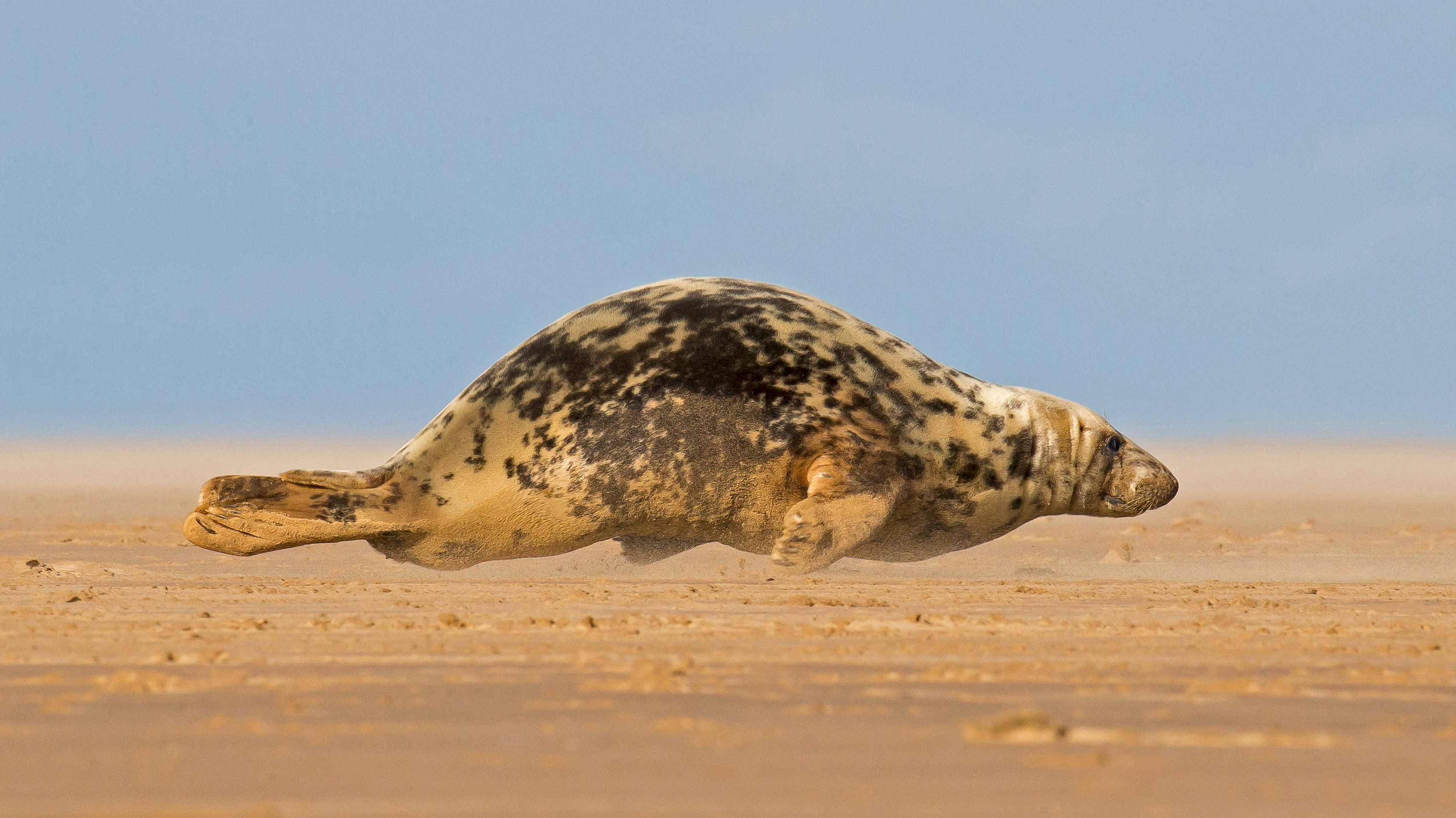 Grey seal hitching itself over the beach at Donna Nook, North 林肯shire, 英格兰 (© Frederic Desmette/Minden Pictures)